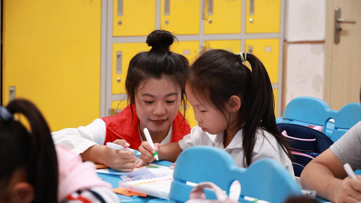 科普团队志愿者梁馨元、宋晓东、王少莹、姜粤龙以“五十六个民族的服饰颜色各不相同”为切入点,启发学生思考颜色的产生、调配等过程。在科普团队志愿者杨翔宇、袁秦帅、刘心洋、刘炼莹及学校老师的帮助下,学生出色地完成了任务,调配出紫色、橙色、绿色、黑色等色彩并为笔下的彩虹增添“新衣”。色彩科普课堂的开展,帮助学生解答了色彩的奥秘,使学生认识到自己拥有一双发现美的眼睛,并引导学生积极发现、探究身边的科学!