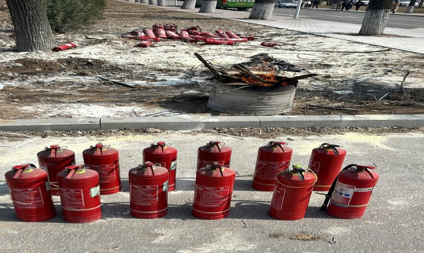 随后,大家在空旷的地方点燃找来的燃料,待火着起来后,消防工作人员指导教师们进行实际操作演练。