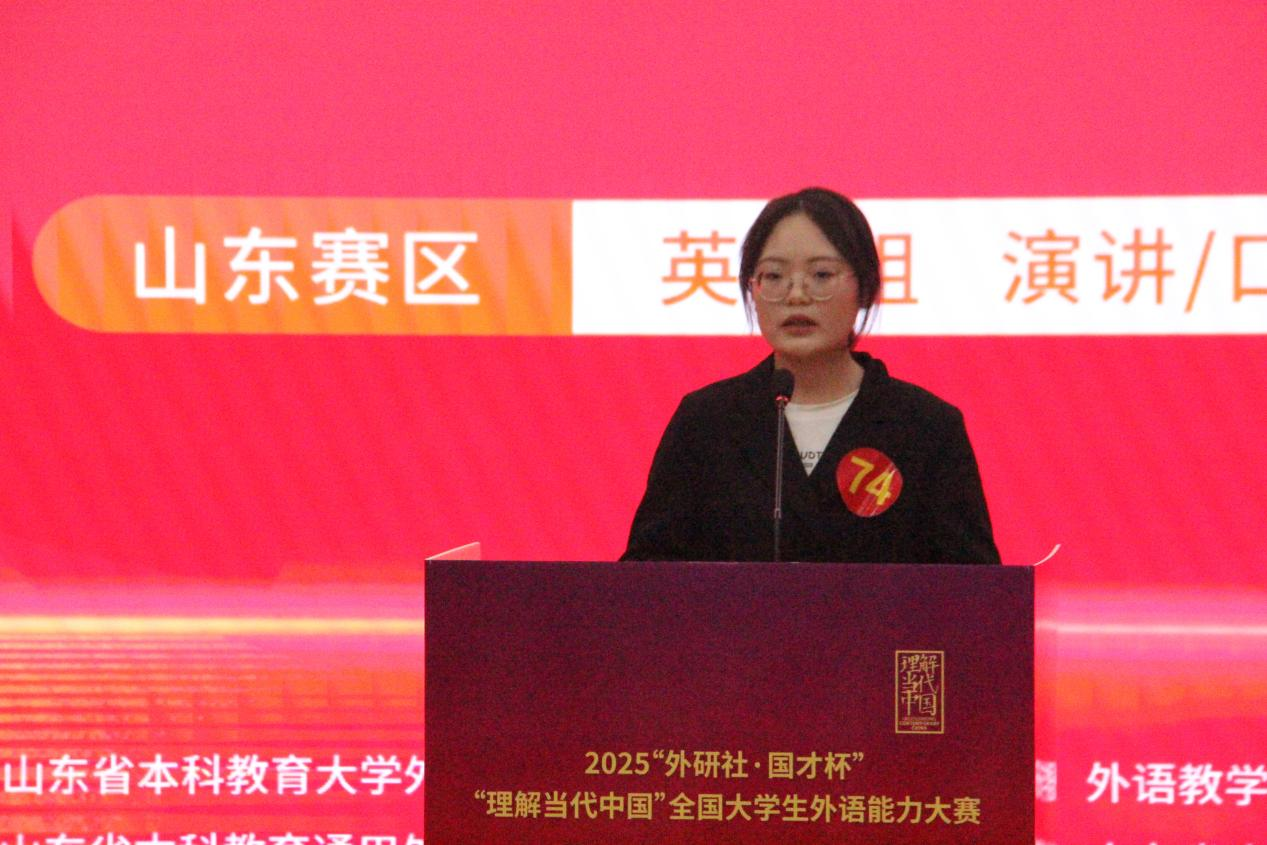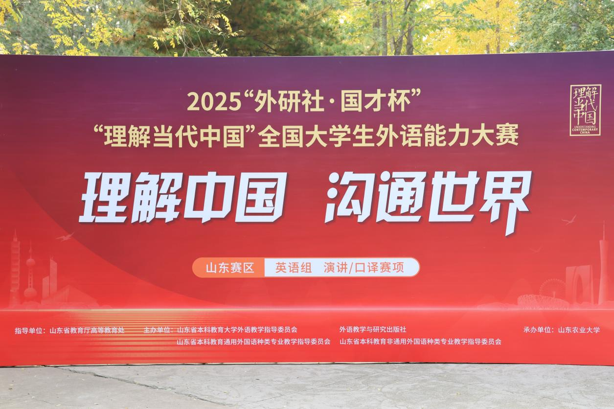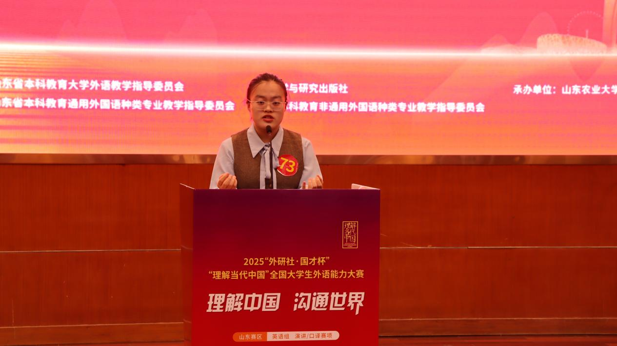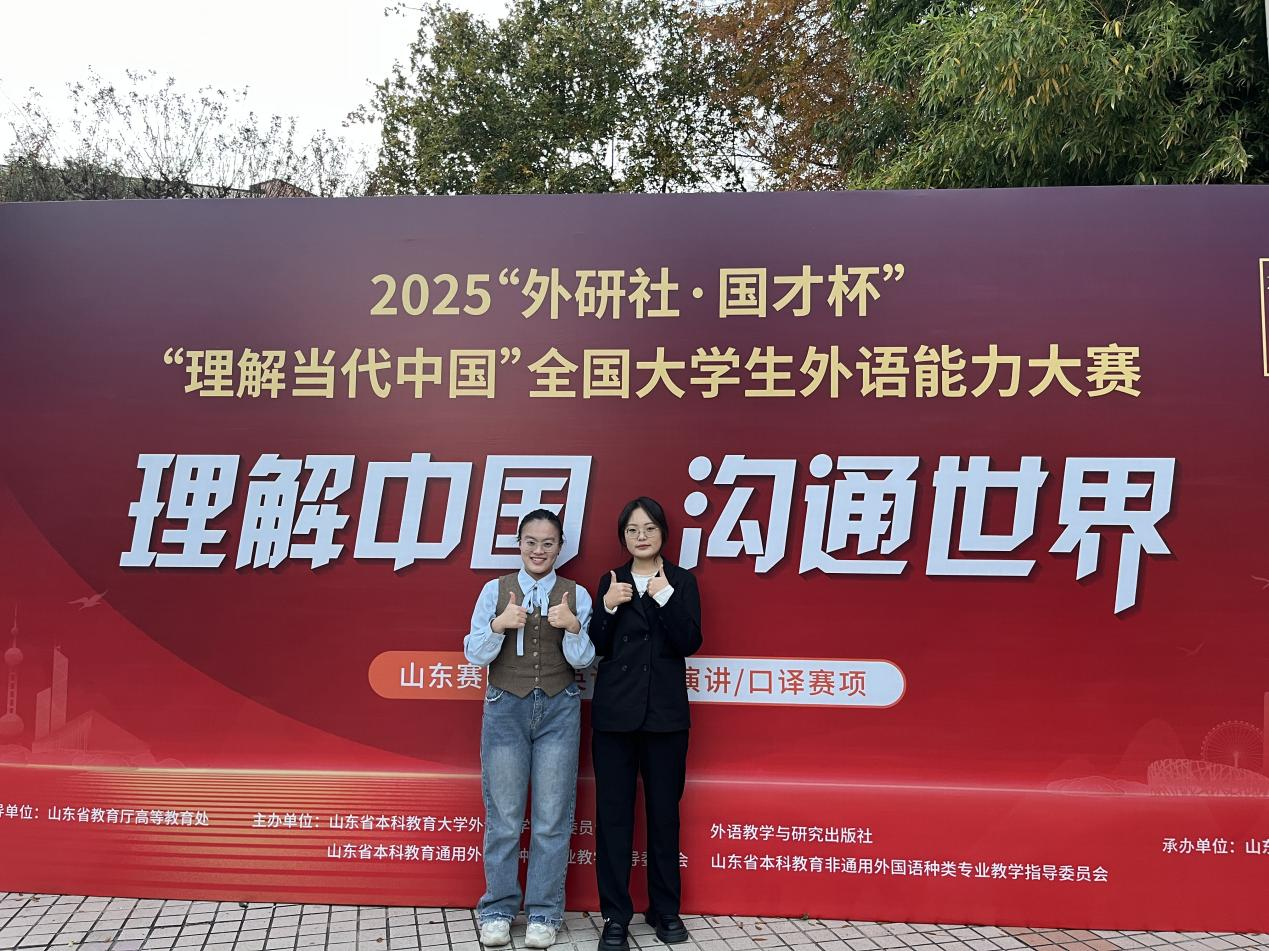 2025年11月1日至2日,2025“外研社·国才杯”“理解当代中国”全国大学生外语能力大赛英语演讲赛项山东省省赛在泰安山东农业大学岱宗校区举行。我校学子在英语教师的带领下参赛,凭借扎实的语言功底和稳健的临场表现荣获优胜奖。虽然未能获得更高奖项,但与全省优秀学子同台竞技的经历让参赛学生获益良多,更激发了持续提升英语能力的决心。