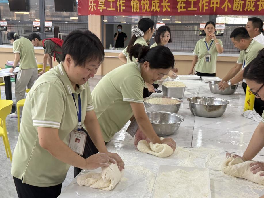 活动伊始,现场井然有序、气氛热烈。老师们迅速组队,依据个人特长明确分工,在揉面、洗菜、烹饪、拌凉菜等环节中各司其职,默契配合。揉面组教师精准配比面粉、酵母与温水,凭借娴熟的手法将面粉揉捏成光滑且富有弹性的面团;洗菜组教师细心挑选、反复清洗,确保食材干净卫生;烹饪与拌凉菜的教师们同样有条不紊,充分发挥厨艺,精心准备每一道菜品。
